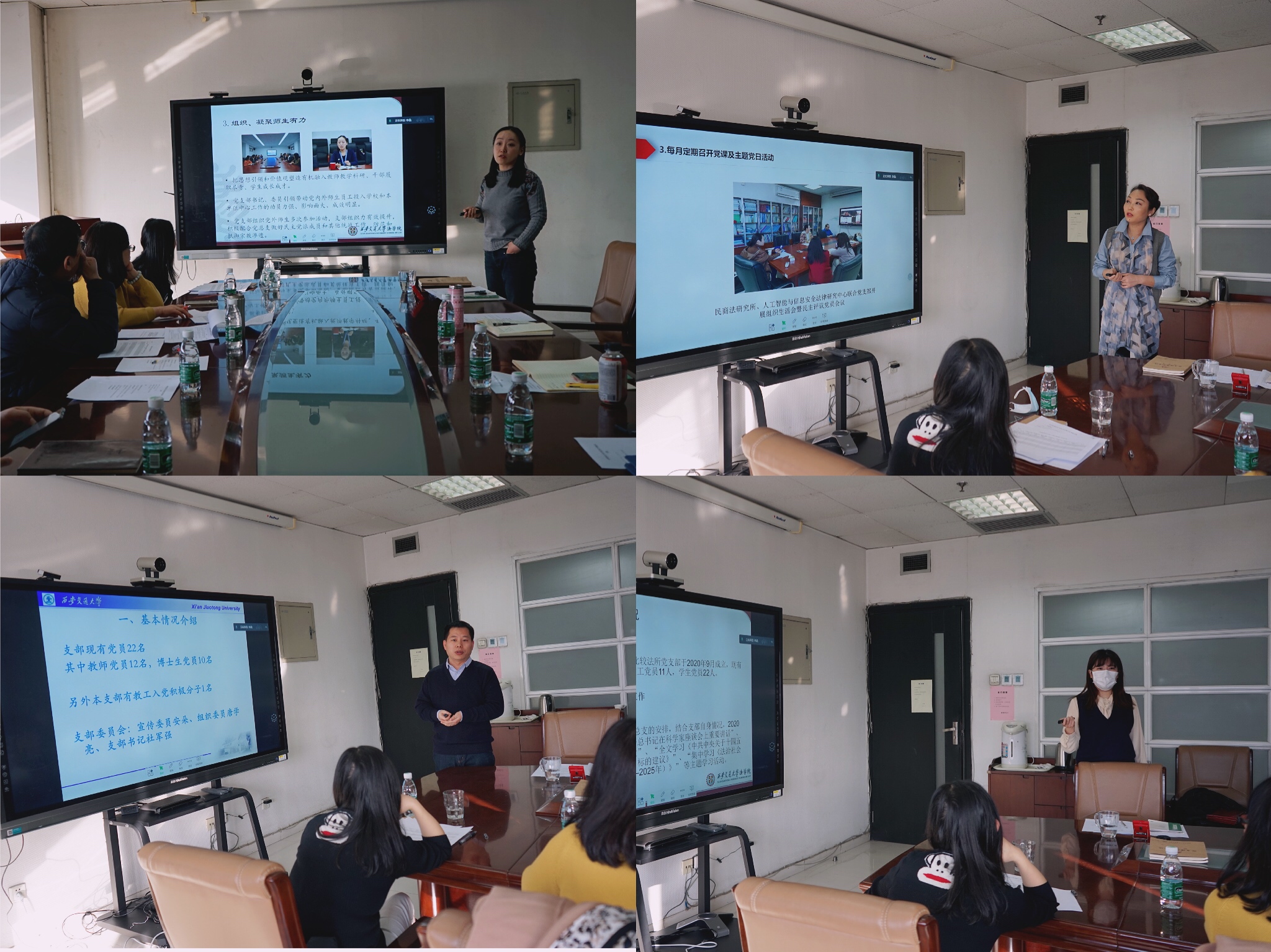 考核会议上,12位支部书记对标支部工作要做到“教育党员有力、管理党员有力、监督党员有力、组织师生有力、宣传师生有力、凝聚师生有力、服务师生有力”的要求,详细汇报了2020年支部工作开展情况。本年度,根据基层科研组织架构,乐竞重组成立5个教工党支部,实现“双带头人”教师支部书记全覆盖。在优化设置党支部的基础上,学院各支部能够按照校党委及学院党总支的要求,严格落实“三会一课”工作计划,创新开展工作。多次围绕学科建设开展支部活动,并邀请校党委常委参加。与省检察院联合共建党支部,与武汉大学乐竞、法医学院研究生党支部开展联合党课,探索跨校、跨专业开展组织生活新模式。组织师生赴照金革命根据地、渭华起义纪念馆等地学习,深入开展“四史”教育。