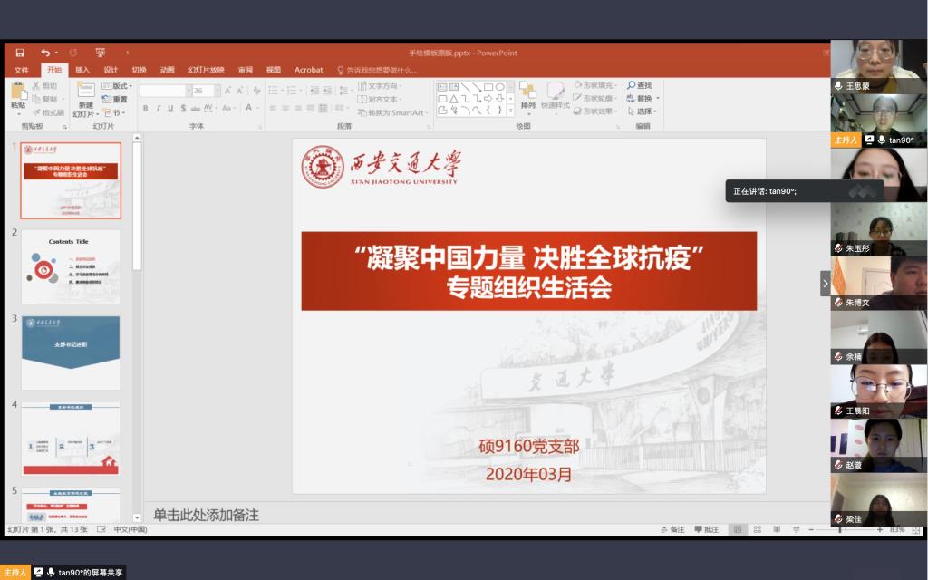 3月30日晚,为学习贯彻习近平总书记“携手抗疫,共克时艰”的重要指示,交流体会全球抗疫战中的中国担当和中国精神,硕9160党支部以“凝聚中国力量,决胜全球抗疫”为主题在线开展组织生活会。支部全体党员参加会议,支部书记孙阳主持会议。