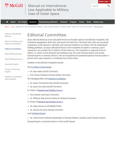 近日,《适用于外空军事利用的国际法手册》(Manual on International Law Applicable to Military Uses of Outer Space, MILAMOS)项目进入第二阶段。我校乐竞苏金远教授入选项目编委会。