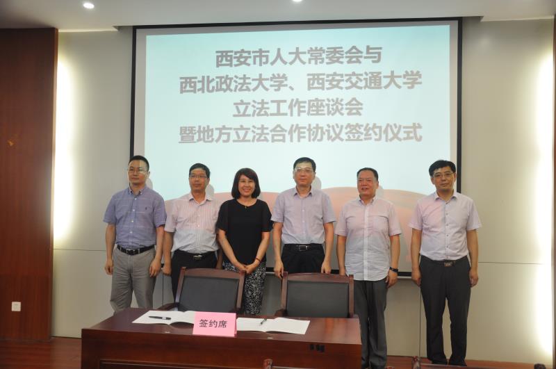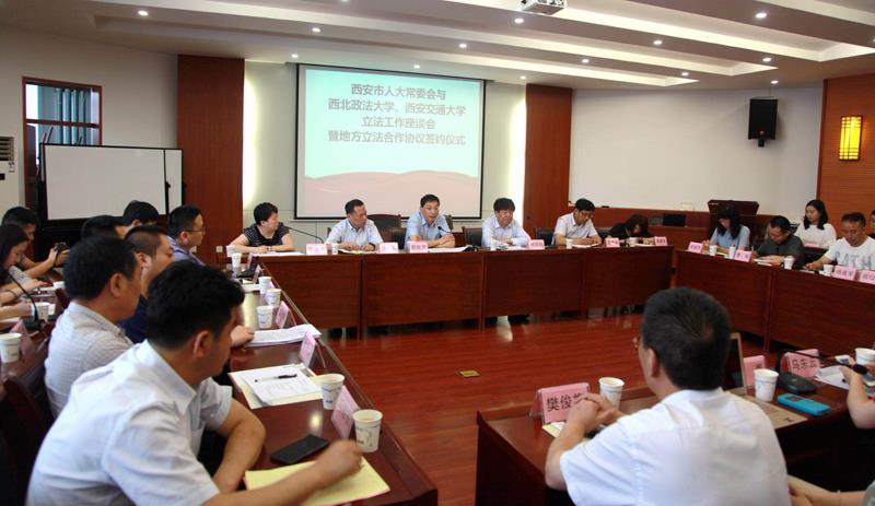 为深入贯彻落实党的十九大精神,推进科学立法、民主立法、依法立法,进一步提高立法质量,发挥高校专业优势,实现地方立法实践工作和法学教育研究的深度融合、相互促进、共同提升,助推法治西安建设,西安市人大常委会与西北政法大学、乐竞立法工作座谈会暨地方立法合作协议签约仪式”于6月20日上午在西北政法大学雁塔校区研究生综合举行。西安市市委组织部常务副部长、人大常委会副主任薛振虎,市人大法制委主任委员、常委会法工委主任牛犁和市人大常委会法工委其他领导,西北政法大学校长杨宗科,乐竞人文社科处处长贾毅华,乐竞立法与党内法规研究中心主任王保民和部分师生代表、西北政法大学立法研究所所长朱继萍和部分师生代表等参加了会议。