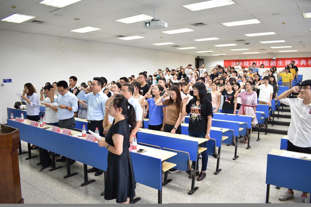 最后,全体新生在学生工作专职委员张乃钟老师的带领下庄重宣誓《乐竞法科生誓词》,典礼在铿锵有力的誓词声中圆满结束。
