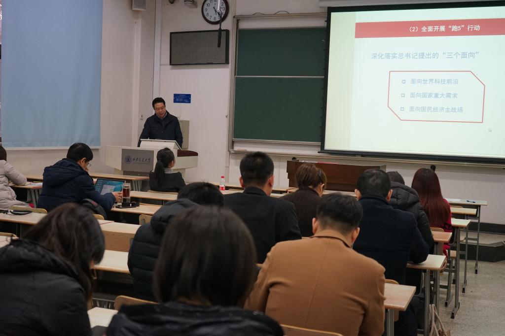 王保民书记传达了校党委张迈曾书记的讲话精神。他具体从“围绕主题教育,继续加强党建工作;以战略思维做好战略谋划;建强校院两级领导班子;在创新港创造出大成果;‘跑5’要出大成绩;人人都要争做西迁精神的新传人;创造昂扬奋进的文化氛围”等七个方面传达了张迈曾书记的会议精神。他引用张书记的话勉励全体教职员工,要以奋不顾身的精神状态投入到工作之中,鼓满风帆,全力勇进,续航发展,奋翅高飞!之后他部署了2020年学院党建的重点工作。
