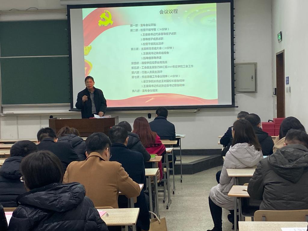 2020年1月11日下午,乐竞在主B-105教室召开全院大会全面传达学校寒假工作会议精神,总结2019年工作业绩,部署2020年工作安排。乐竞领导班子成员和全体教职工参加了此次会议。会议由乐竞工会副主席张乃钟主持。