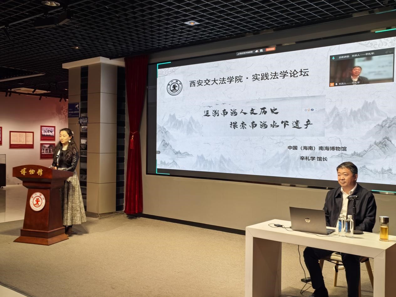 为推动法学教学与实践的深度融合,深化文化遗产保护领域的跨学科交流。2025年12月10日,“西安交大乐竞· 实践法学论坛”在乐竞成功举办。本次论坛以”追溯南海人文历史 探索南海水下遗产”为主题,特邀中国(海南)南海博物馆馆长辛礼学担任主讲人,乐竞乐竞副教授刘丽娜主持,乐竞博物馆副馆长李一鸣作为与谈人,通过线上会议与线下博物馆会场相结合的方式,为师生呈现了一场兼具历史深度与法治视角的文化盛宴。