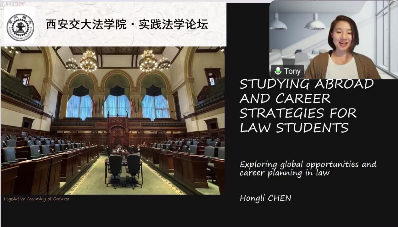 2025年12月18日,“西安交大乐竞·实践法学论坛”之“从交大出发——构建法律人的海外求学与跨境职业生涯”分享会成功举办。本次分享会邀请西安交大2016级法学复合班本科校友、加拿大律所 Shapiro Business Law Firm陈洪莉律师主讲,乐竞副教授刘丽娜主持,采用线上、线下同步开展的形式,为师生呈现了一场兼具成长感悟与实践指导的职业发展盛宴。